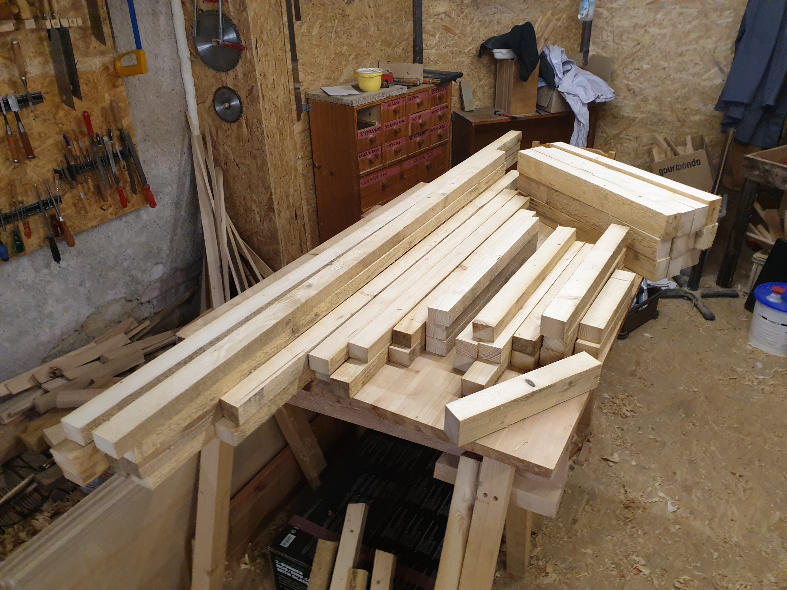 An diesem Wochenende habe ich aus groben Bohlen die Kanthölzer grob herausgesägt, abgerichtet, auf eine grobe Länge gesägt und auf 33x33m und 33x50mm Kantenlänge gehobelt.