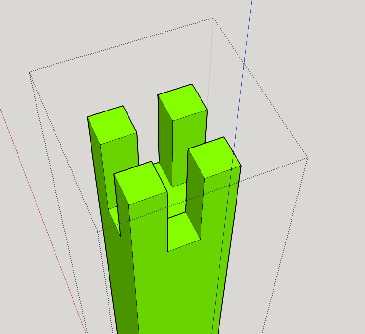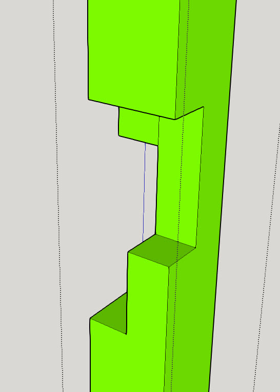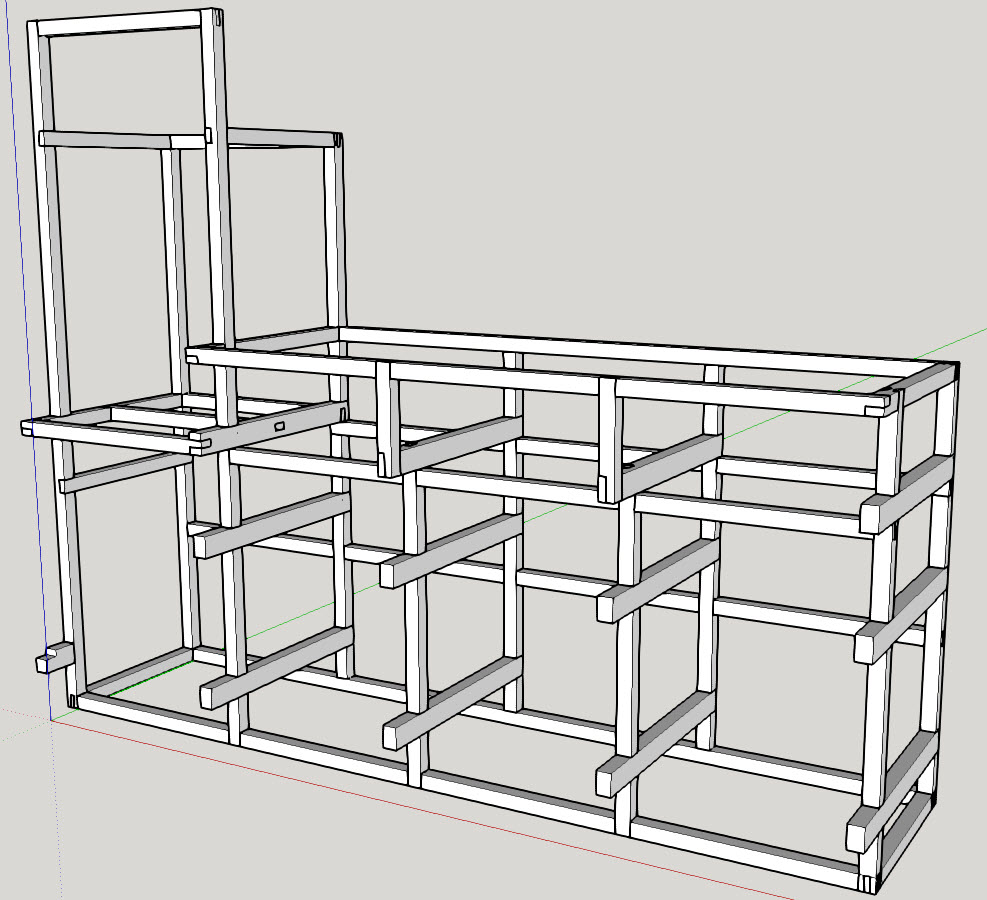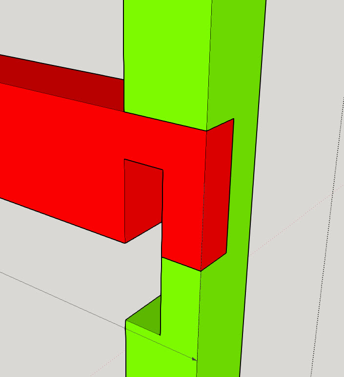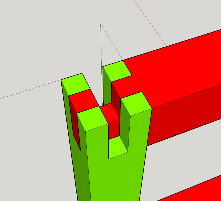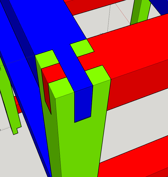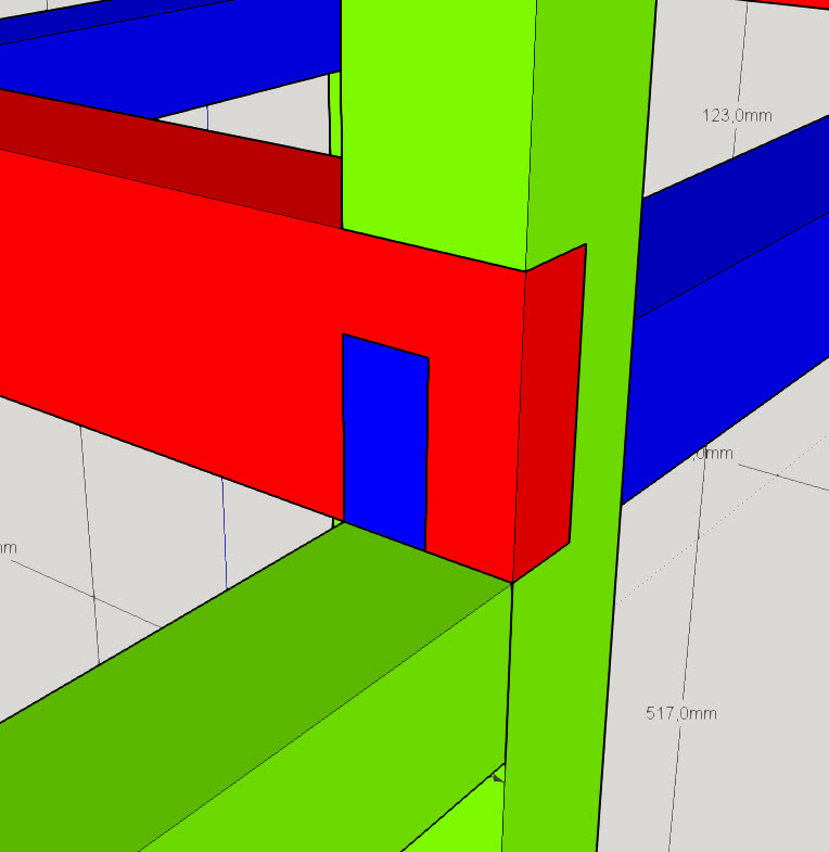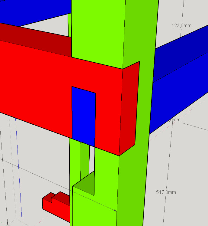 Es ist mein Ziel den gesamte Block nur mit geleimten Zapfenverbindungen zu konstruieren! Keine Schraube und keinen Winkel (außer für die Befestigung am Boden). Dadurch kommen ein paar komplexe Verbindungen zustande. Der Aufwand kann wohl nicht durch die evtl. Gewichtsersparnis gerechtfertigt werden, aber da die Möbelschreinerei zu meinen Hobbies gehört, ist es mehr die Herausforderung die mich zu dieser Bauweise bewegt. Hier mal zwei Beispiele aus den CAD Zeichnungen: