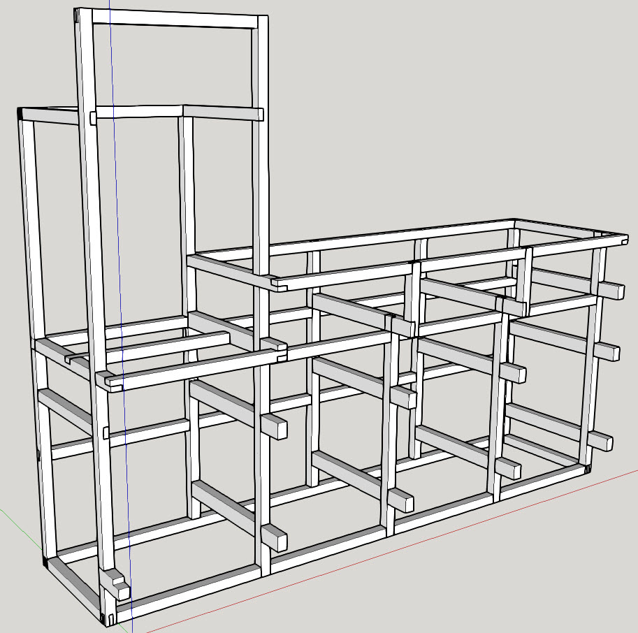 Bei einer Käntenlänge von 33x33mm sind die einzelnen Teile recht filigran. Miteinander verleimt ergeben sie aber eine stabile Verbindung und in der Gesamtkonstruktion stützen sich alle Verbindungen gegenseitig. Ein solch großes Gebilde habe ich allerdings auch noch nie gemacht und da ich kein Statiker bin, muss ich mich auf meine Erfahrungen verlassen. Evtl. muss ich später noch ein paar Querverstrebungen einsetzen. Bisher kalkuliertes Gesamtgewicht: 28kg