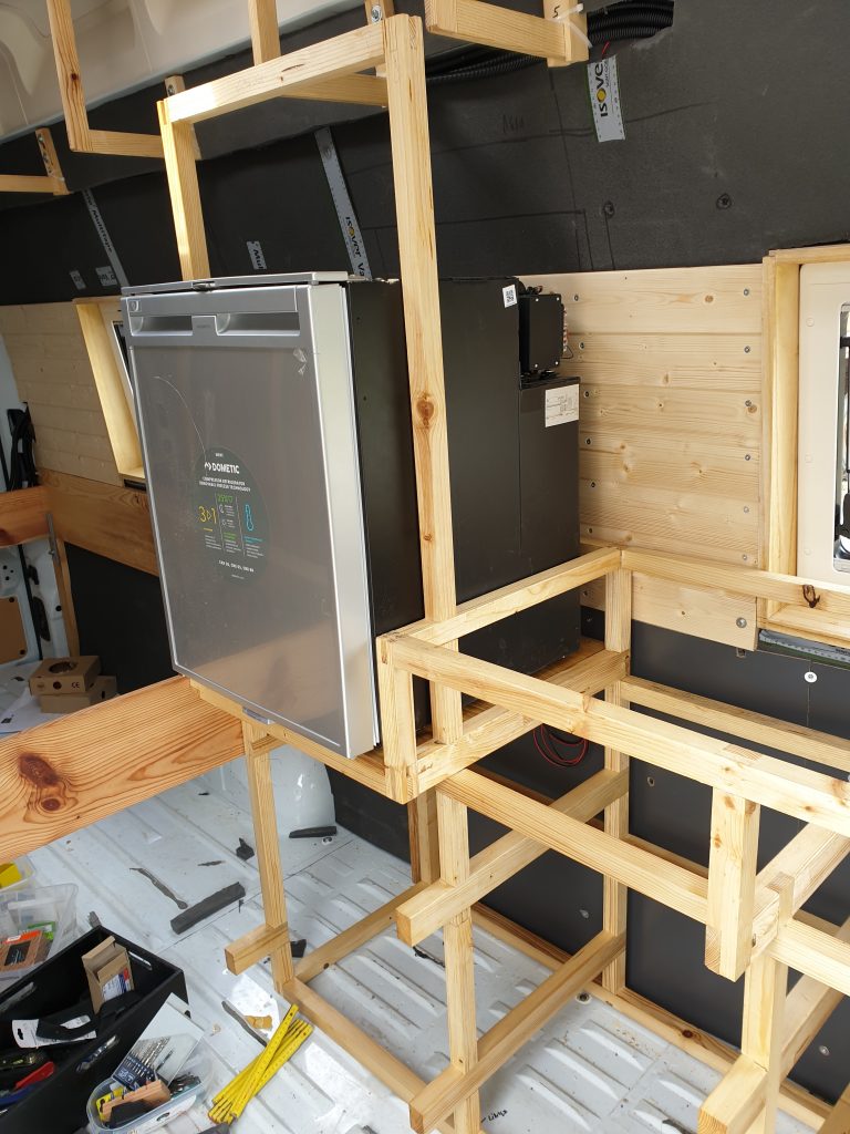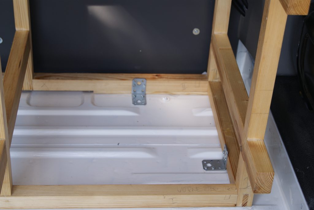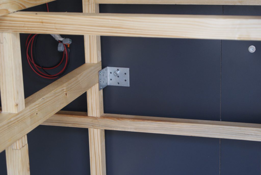 Nachdem die Farbe über Nacht getrocknet war, konnte ich das Gerüst wieder zurückschieben und es mit der Wand und dem Boden verschrauben. An der Wand, hinter der Dämmung befinden sich ja die Rifnuts mit dem 8mm Gewinde. Hier konnte ich einen massiven Winkel mit dem Gerüst verbinden. Am Fußboden habe ich in regelmäßigen Abständen das Gerüst ebenfalls mit Winkel befestigt. Spaxschrauben für das Holz und selbstschneidende Blechschrauben für den Boden. Da bewegt sich jetzt nichts mehr, sehr stabil! Es fehlt nur noch die Befestigung über dem Kühlschrank. Der ist momentan „nur“ an dem Holzrahmen befestigt. Der Rahmen selber hat aber nicht die Kraft, den Kühlschrank im Ernstfall zu halten. Über diese Konstruktion werde ich in einem eigenen Beitrag schreiben.