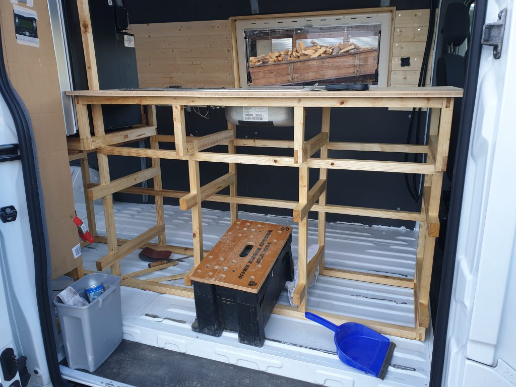 Bevor ich das Küchengerüst endgültig im Fahrzeug befestigen kann, musste ich noch ein paar Vorbereitungen treffen. Ich werde ja alle Einbaumöbel direkt auf dem Fahrzeugboden befestigen. Dämmung und Bodenplatten dann nachträglich verlegen, daher muss ich den Boden vor der endgültigen Befestigung auf der Fläche des Möbels prüfen und versiegeln. Ich mache das mit einer weißen Rostschutzfarbe, nachdem ich den alten Lack mit Schleifpapier etwas angeraut habe.