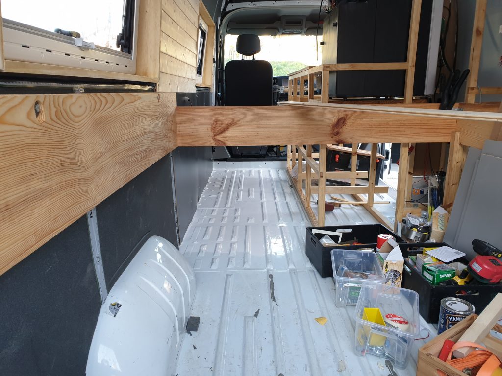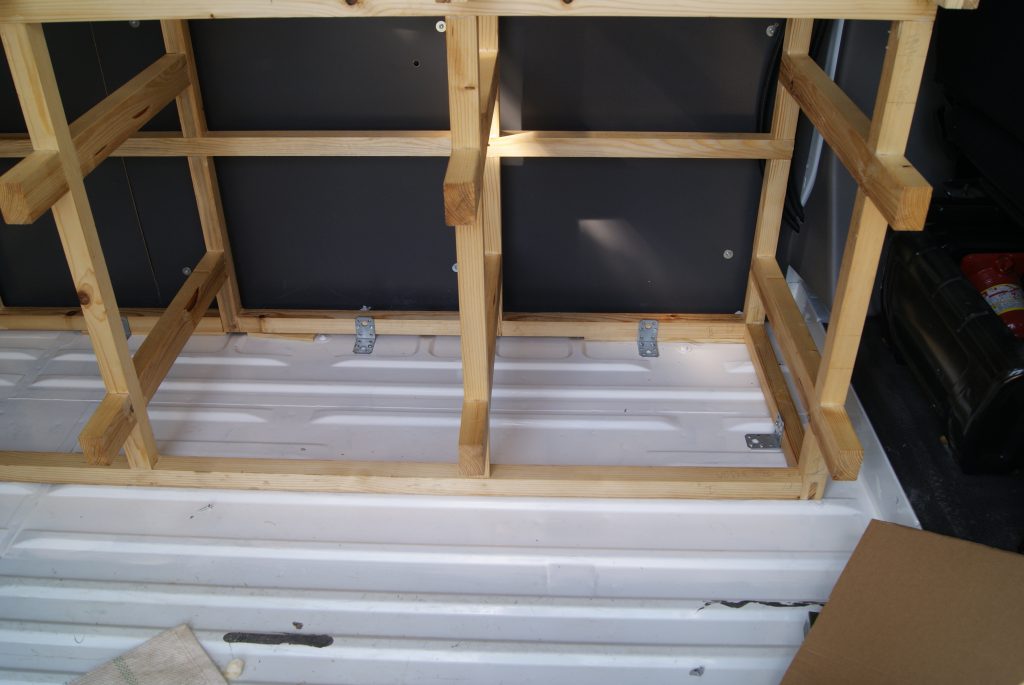 Die meisten meiner „Kommilitonen“ haben ein anderes Bodenkonzept gewählt, sie verlegen als erstes über die gesamte Bodenfläche ein Holzgerüst und verkleben oder verschrauben dann die Holzleisten auf dem Blechboden. Dann dämmen sie mit verschiedenen Materialien die Zwischenräume und verlegen eine große Platte für den Fußboden, meistens eine 10-15mm Siebdruckplatte, die sie ihrerseits auf die Holzlatten verschrauben. Auf der Siebdruckplatte befestigen Sie dann die Möbel.