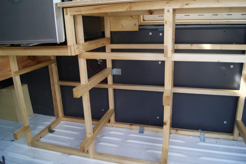 In unserem Camping-Van gibt es aber zwei Bereiche, die einen unterschiedlichen Boden bekommen und der auch unterschiedlich belastet wird. Hinten haben wir das Bett und darunter den „Keller“ oder wie manche auch sagen, die „Garage“. Den Boden für den „Keller“ werde ich mit einer 10mm Siebdruckplatte belegen, aber nur da wo kein Möbel steht. Dort wird kaum jemand stehen, also muss ich den nur bedingt trittfest gestalten. Während der vordere Teil hauptsächlich der Küchenbereich ist, dort werden wir sehr viel stehen und gehen. Hier werde ich einen Echtholzfußboden aus Lärchenholzbrettern verlegen. Unter dem Küchenblock kann ich mit 6mm Pappelsperrholz als Abdeckung über den Dämmplatten arbeiten, denn darüber werden ja die Schubladen sein. Überall werden Dämmstoffplatten (30mm XPS) verlegt.