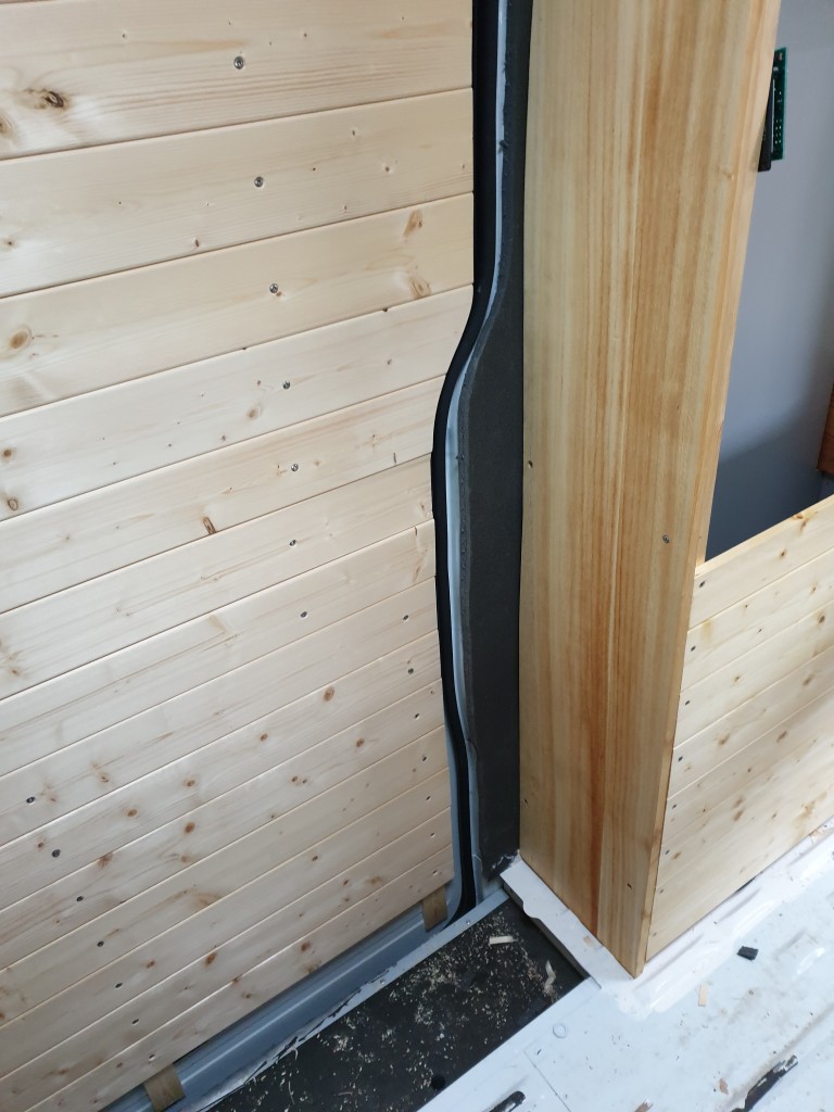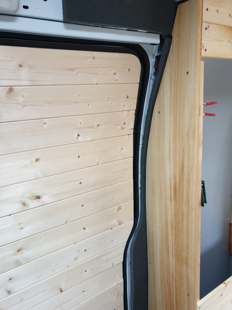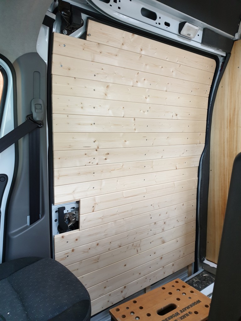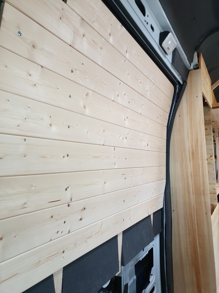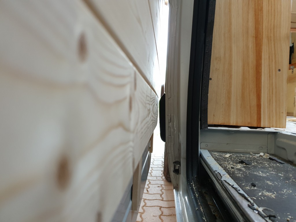 Für die Isolierung habe ich, wie bei den anderen Wänden den Schaumstoff von Reimo genutzt. Für die Befestigung der Saunabretter habe ich wieder Holzleisten 9mm stark und 50mm breit direkt an das Innenblech geschraubt. Allerdings konnte ich die Dämmmatten nicht auf die Holzleisten auflegen, da ich max. 25mm Stärke Aufbauhöhe hatte. Warum? Weil die Schiebetür auch nach der Verkleidung noch geöffnet werden soll 😉 und die muss ja nach hinten an der Seitenwand des Fahrzeuges vorbei. An einigen Stellen hatte ich sogar weniger Platz, einmal an der außen liegenden Laufschiene und weiter unten an der Plastikverkleidung. Später mehr dazu. Hier erstmal ein paar Bilder vom Baufortschritt.
