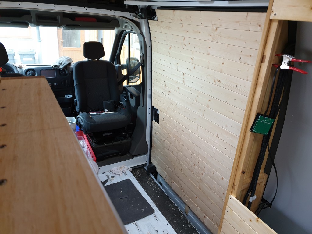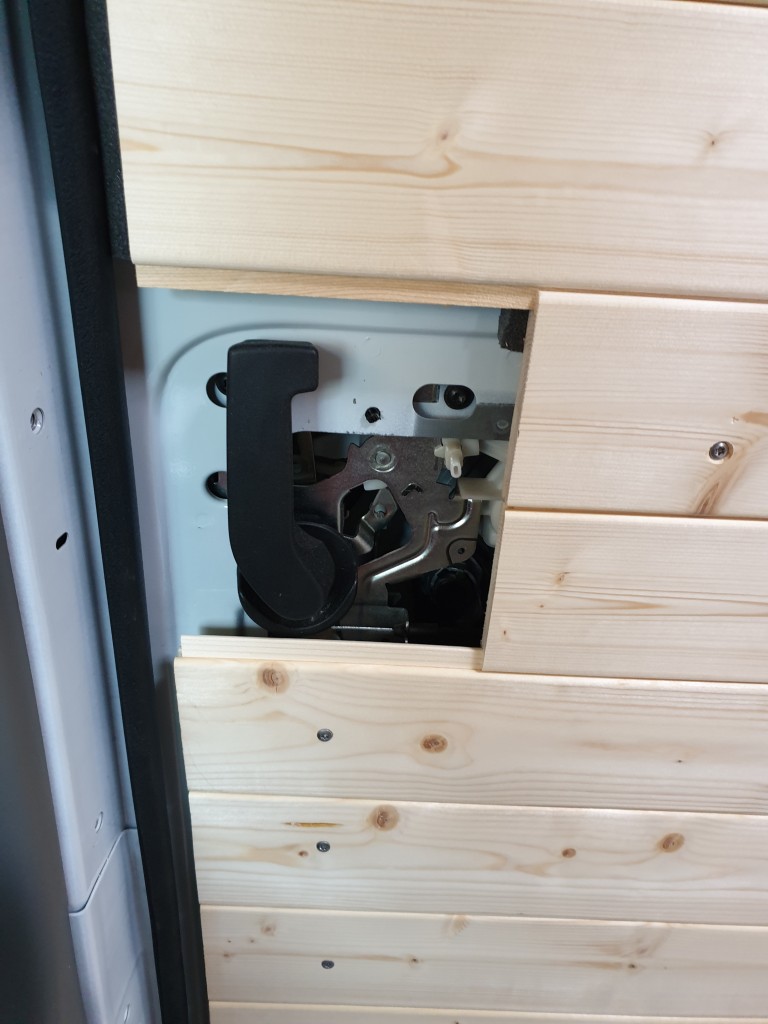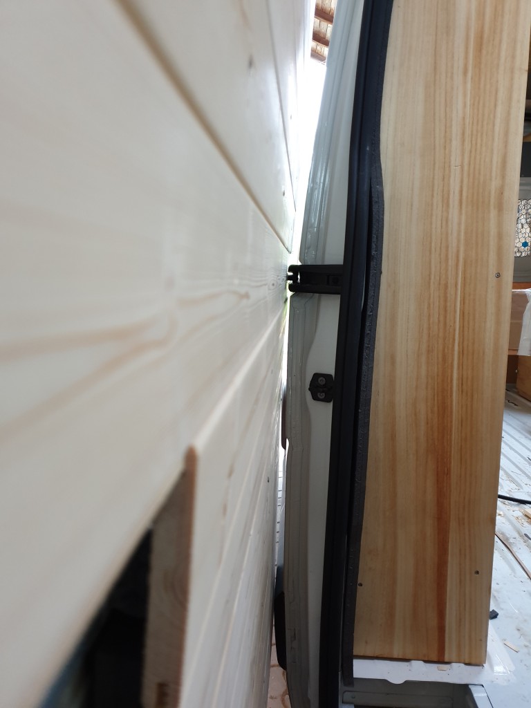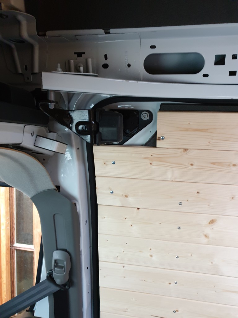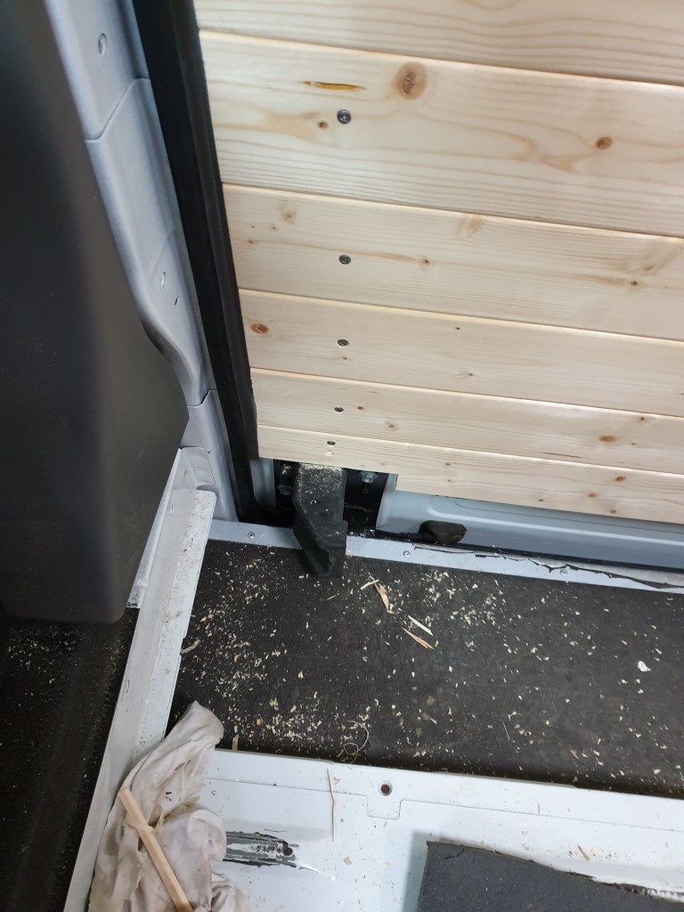 Für die Isolierung habe ich, wie bei den anderen Wänden den Schaumstoff von Reimo genutzt. Für die Befestigung der Saunabretter habe ich wieder Holzleisten 9mm stark und 50mm breit direkt an das Innenblech geschraubt. Allerdings konnte ich die Dämmmatten nicht auf die Holzleisten auflegen, da ich max. 25mm Stärke Aufbauhöhe hatte. Warum? Weil die Schiebetür auch nach der Verkleidung noch geöffnet werden soll 😉 und die muss ja nach hinten an der Seitenwand des Fahrzeuges vorbei. An einigen Stellen hatte ich sogar weniger Platz, einmal an der außen liegenden Laufschiene und weiter unten an der Plastikverkleidung. Später mehr dazu. Hier erstmal ein paar Bilder vom Baufortschritt.