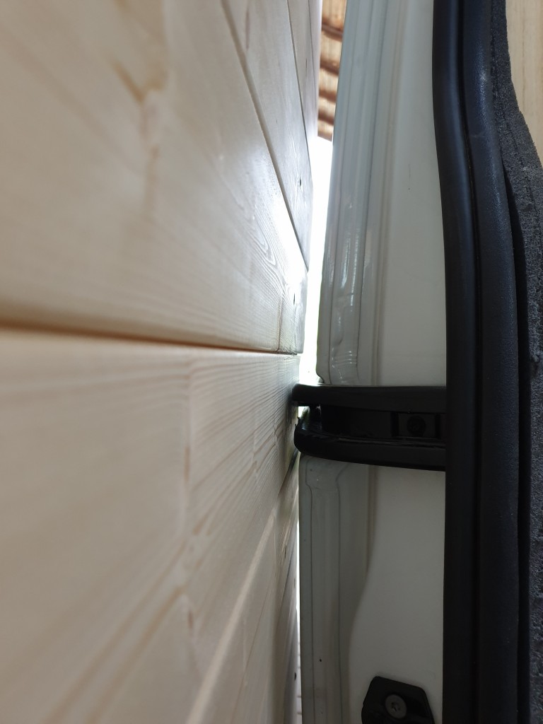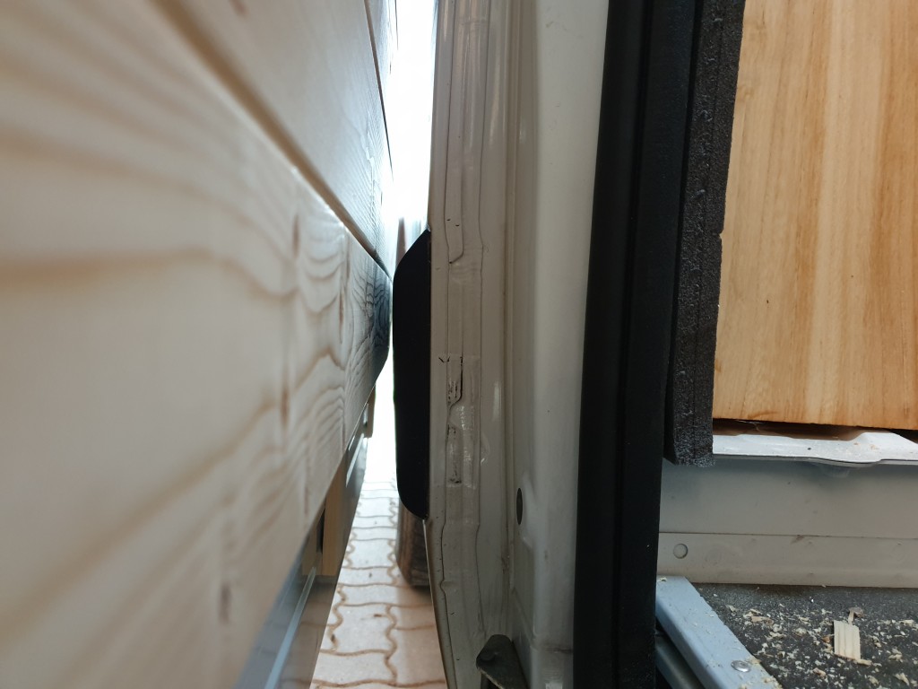 Das hat die Geräusche beim Schließen der Tür um einiges verbessert (wenn ich da so an meinen alten VW Bulli denke …). Allerdings fiel mir auf, dass das äußere Blech beim Schließen immer erheblich „wabbelt“ (kann das nicht anders beschreiben). Innen konnte ich dann erkennen, dass sich die Klebenaht des Verbindungsblechs zwischen Innenrahmen der Tür und dem äußeren Blech gelöst hatte. Da das ein schwer zugängiger Bereich ist, in dem man keinen Druck für eine neuen Klebung aufbauen kann, habe ich eine kleine dünne Holzleiste genommen, an beiden Seiten mit DECAsyl MS 2 Kleber versehen und zwischen Verbindungsblech und Aussenblech geklemmt. Zum Einlegen der Holzleiste hatte ich vorher einen kleinen Holzkeil eingetrieben. Nach dessen Entnahme pressten die Bleche die Holzleiste ein. Die ersten Tests zeigten dann dass das „Wabbeln“ weg war.