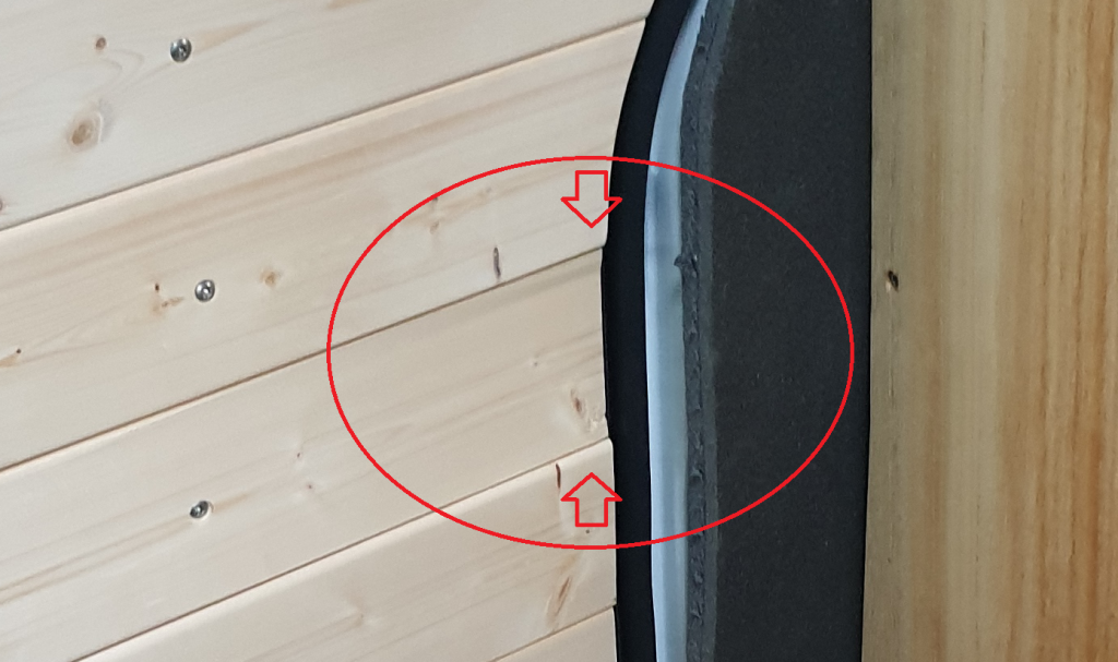 Bei der Montage des unteren Teils, wurde klar, dass Dämmmatte und Saunabrett auf Höhe der Schiene, außen nicht genügend Platz haben werden. Es fehlten nur ein paar Millimeter, also habe ich das Ende des Saunabrettes dann nach hinten schräg abgehobelt. Auf dem nachfolgenden Bild kann man den Absatz erkennen.