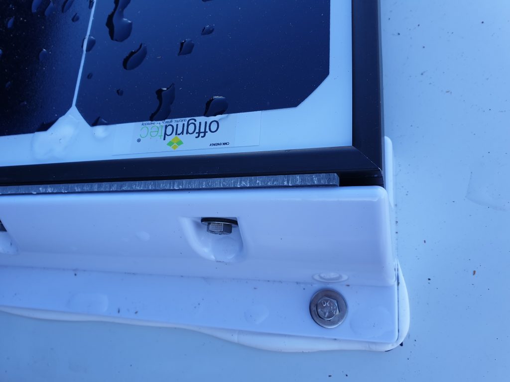 Zur Befestigung habe ich mich für die klassischen Spoiler (in weiß) entschieden. Da die Paneelen quer zum Fahrzeug montiert wurden, liegen die jetzt längs zum Fahrzeug. Damit können sie ihre Aufgabe als Spoiler nicht aufnehmen, bieten dafür aber schönen Halt. Der sich ergebene Winkel ist damit sehr klein.