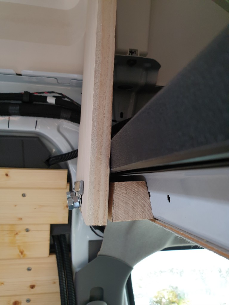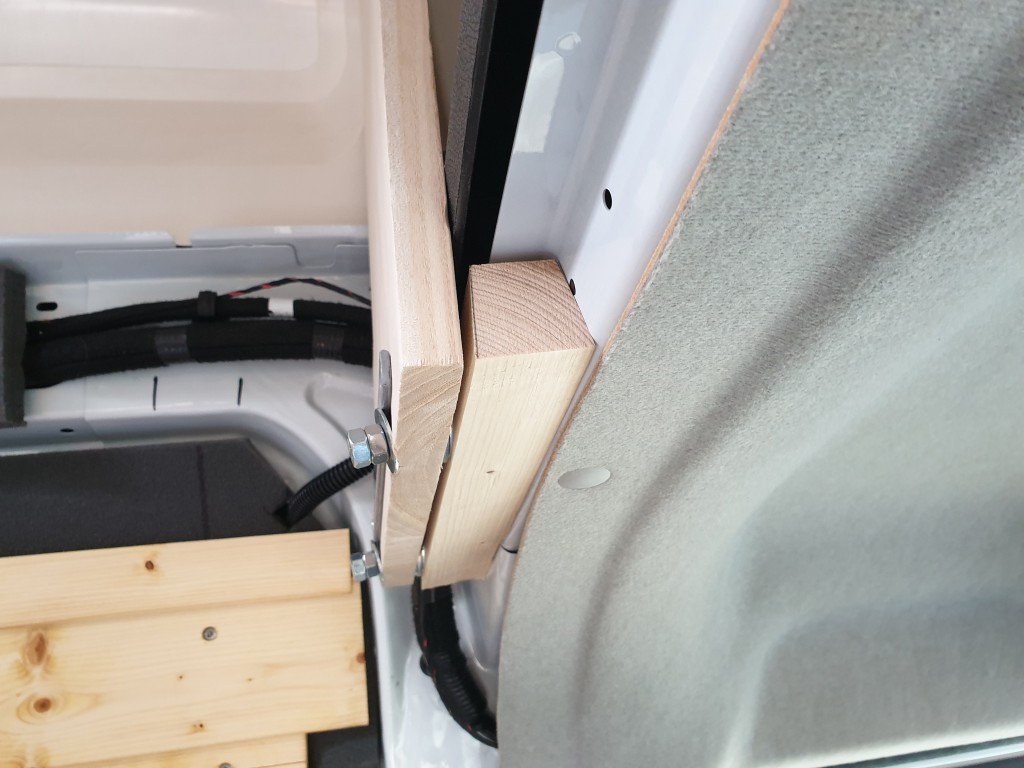 Für die Halterungen der Hängeschränke muss ich ganz vorne noch einen Übergang finden. Hier trifft die Fahrerkabine auf den Laderaum, hier war vorher die Zwischenwand montiert und hier laufen sehr viele Kabel zusammen. Ein schwieriger Ort, keine geraden Flächen, um ein Holzstück anbringen zu können. Ich habe mich recht früh entschlossen, die eingelassenen Schraubgewinde in der Karosserie zu nutzen, denen die Zwischenwand montiert war. Leider ist dieser Rahmen vertikal nicht im rechten Winkel.